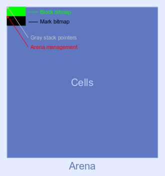 Since cell indices don't start at zero, the first few bytes of the block and mark bitmaps can be used for other metadata related to the arena. At least 16 bytes can be used for arena management and for the gray stack pointers, since the minimum arena size is 64 KB.