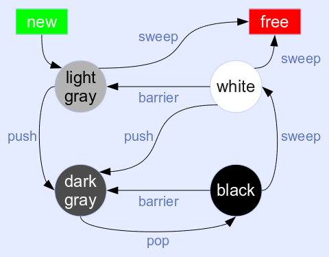 Q: this doesn't seem to be the whole story: "The write barrier doesn't need to access the mark bitmap, which avoids polluting the cache with GC metadata while the mutator is running.". True, if the gray bit is already set. But if the gray bit is clear then not only does it need to be set, you also then need to check the black bit and IFF it is set then push the object onto the mark stack. e.g.