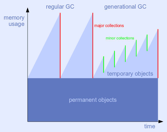The generational mode of the collector is automatically triggered by workloads with a high death rate for young allocations. Running (say) five minor collections that deal only with young allocations plus one major collection ought to be cheaper than running (say) two major collections in the same time span. And the maximum memory usage should be lower, too. The collector returns to the regular, non-generational mode, in case these assumptions turn out not to be true.